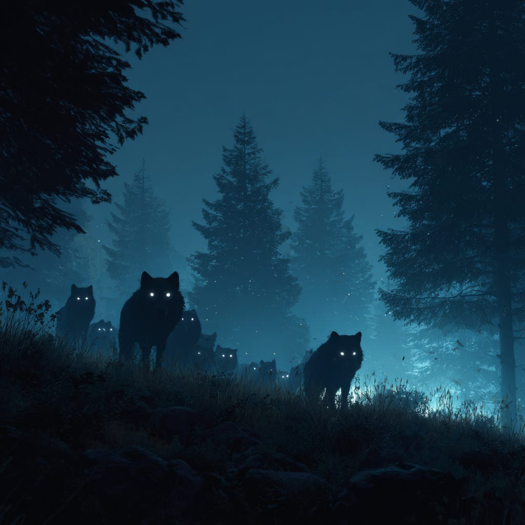 Deep growls brought my attention around. Black wolves with glowing white eyes emerged from the forest behind us. They were larger than any wolves I’d seen and there were far too many of them for comfort. Dozens of the dark beasts emerged from the shadows, stalking toward us.